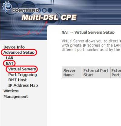 Once logged into the Comtrend, click on Advanced Setup on the left hand side. Then click on NAT and then click on Virtual Servers. Finally click on Add to begin setting up the Virtual Servers.