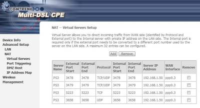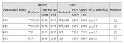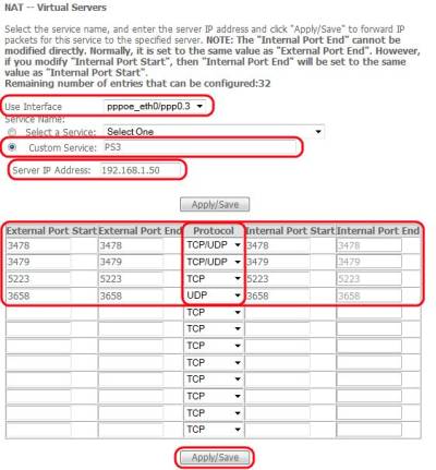 In the Virtual Servers section you will want to select the Interface. We will want to use the PPPoE interface for most cases. Then you will want to select Custom Service, here you can put PS3. Next we will want to enter the Server IP address of the PS3 that we set, for our example we'll use 192.168.1.50. Now you will want to enter the following port information that is shown below. Please notice the Protocols that are being used as well. Once you have entered all the information, please click on Apply/Save. You may click the image to enlarge the text.