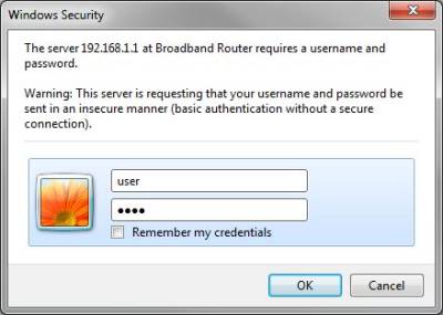 You should now be prompted for the username and password to the router. The username is user and the password is user. Then press OK.