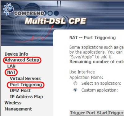 Once logged into the Comtrend, click on Advanced Setup on the left hand side. Then click on NAT and then click on Port Triggering. Finally click on Add to begin setting up the Port Triggering.