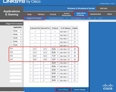Once logged in to the Linksys router, click on Applications & Gaming at the top and then Port Range Forward on the sub-menu. Enter the following information in the Port fields. Once completed, press Save Settings at the bottom of the page. You may click the image to enlarge the text.