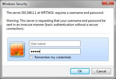 You should now be prompted for the username and password to the router. For a standard Linksys router you will leave the username blank and type admin for the password. Some Linksys router do require admin for the username and admin for the password.