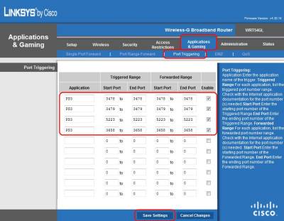 Once logged in to the Linksys router, click on Applications & Gaming at the top and then Port Triggering in the sub-menu. On the Port Triggering page, enter the following values and then press Save Settings at the bottom. You may click the image to enlarge the text.