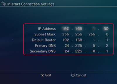 The next screen will prompt you for the IP address information. You may use this information displayed below for your Playstation.