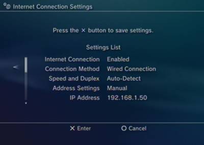 NOTE: By enabling a static IP address on your Playstation3, you may run in to connectivity issues when attempting to connect to the internet at different locations. If you do run in to connectivity issues at other locations, you must turn off the static IP.