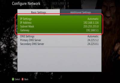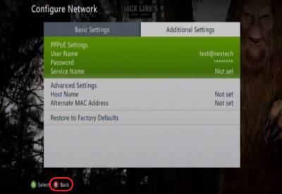 Once you have hit Done, you will be brought to the Additional Settings tab. From here you will want to hit the B button to go back and you should be ready to use the PPPoE connection. You may run a test to Test the Xbox Live connection on this menu as well.