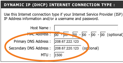 Depending on how your D-Link router is set up, you will either have a section on his page labeled Dymanic IP (DHCP) Internet Connection Type or PPPOE. Under whichever field you have, there will be a spot that says Primary DNS Address and Secondary DNS Address. By default, they will be blank. Type in the following DNS Addresses: