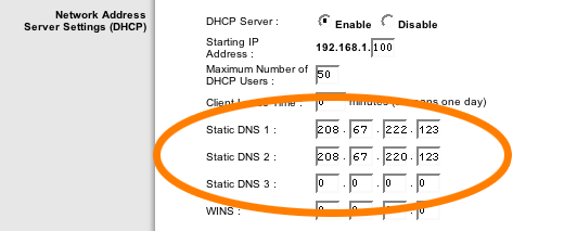 Towards the middle of the page, put a check mark next to Use the following Static DNS IP address and type in the following DNS server addresses: Primary DNS server: 208.67.222.123 Secondary DNS server: 208.67.220.123