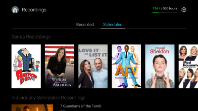 There are two tabs: Recorded (programs that are available to view) and Scheduled (upcoming programs that are scheduled to record). Content is grouped by Series and Movies within each tab section.