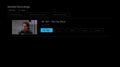 When the user selects a movie from the Recorded content list, an overlay will appear with the options of Play, Stop, and Info.