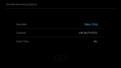 Recording Options. When selected, an additional menu appears in which the user can select to record New Only or New & Reruns. The user may also indicate the channels on which they would like to record the series and whether they would like to extend the recording on an ongoing basis.