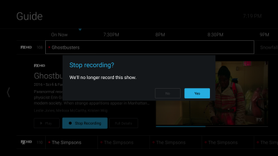If the user wants to cancel a recording that is in progress, they may select stop recording from the inline info module on the live guide, and a dialogue box will appear verifying that they no longer want to record the program.